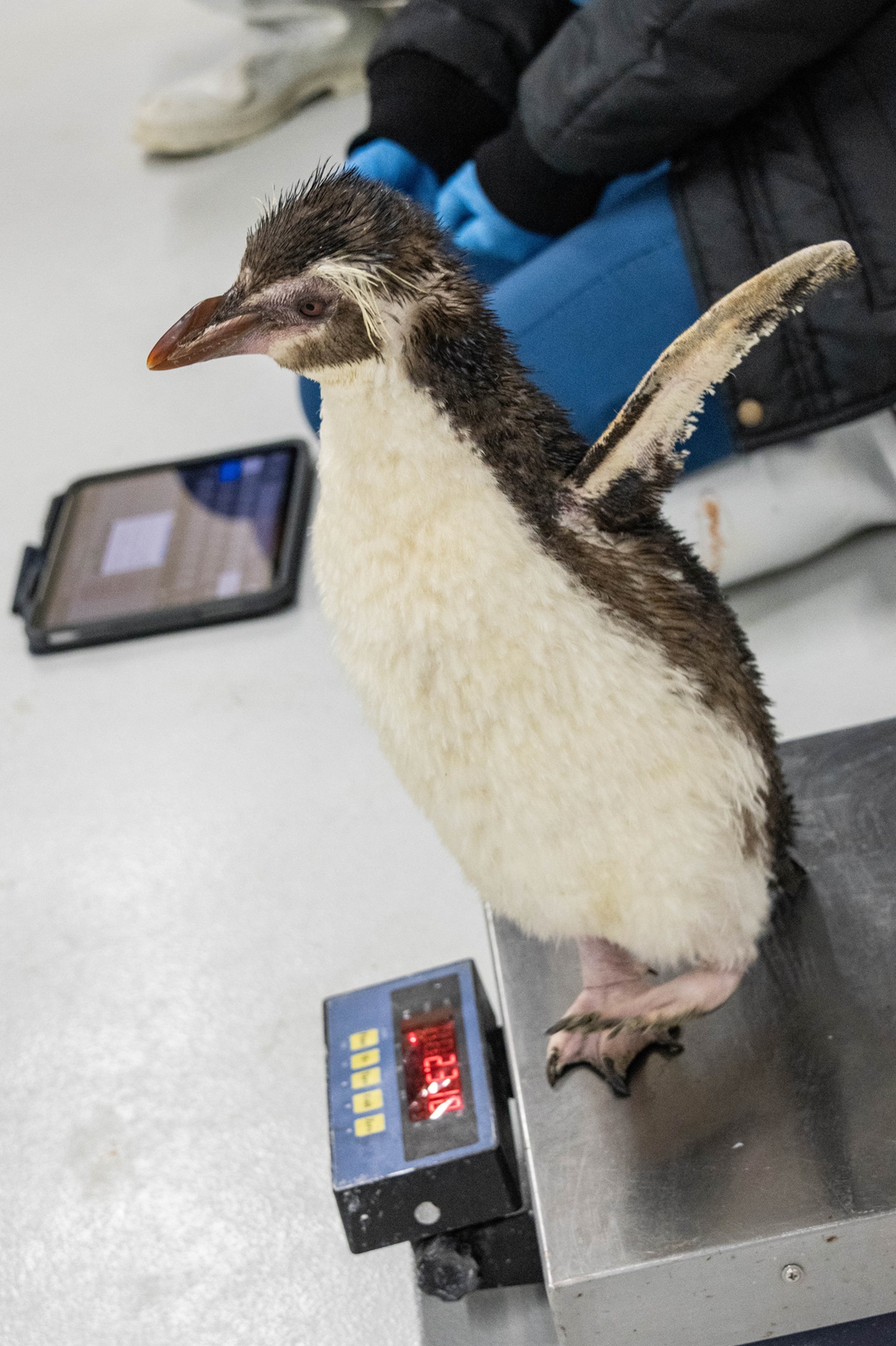 A penguin keeper hand-feeding Pascale as they take the time to familiarise themselves with her and help her settle in.