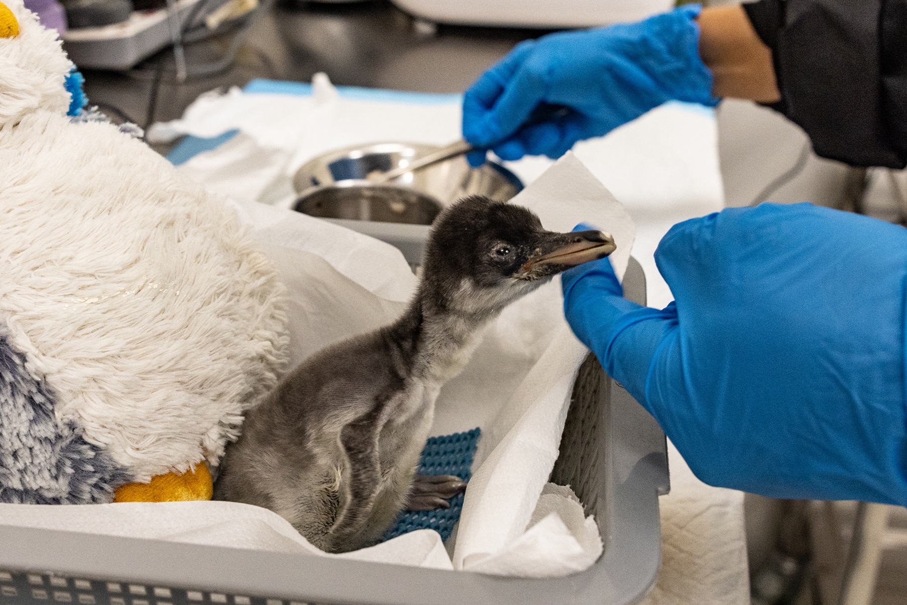 The chick is being housed in a temperature-controlled brooder where a penguin soft toy is provided to offer warmth and comfort, helping it feel secure and supported as it grows.