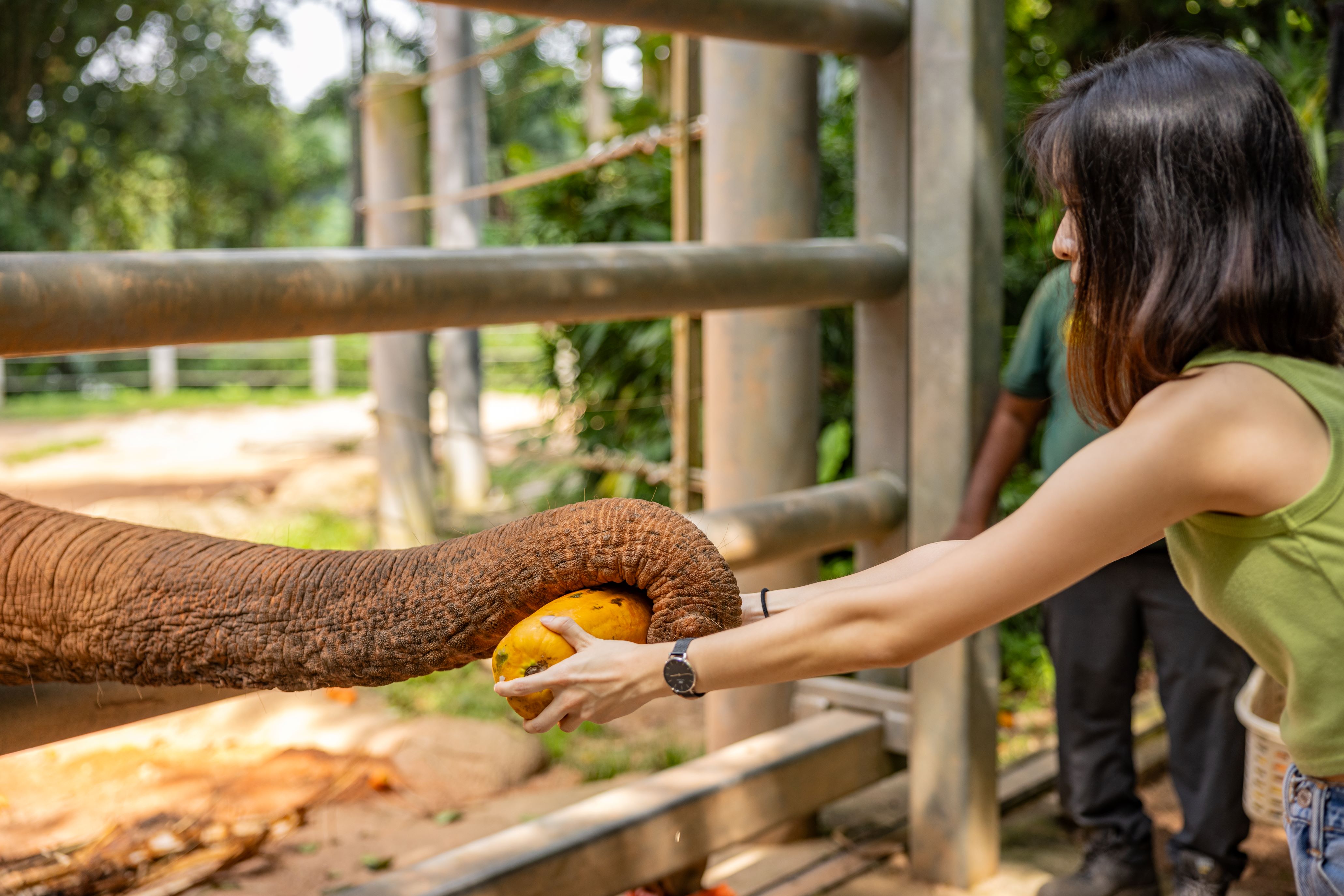 An elephant takes a papaya from a guest with its powerful trunk. Elephants consume fruits whole, contributing to forests in the wild as they disperse seeds through their dung.