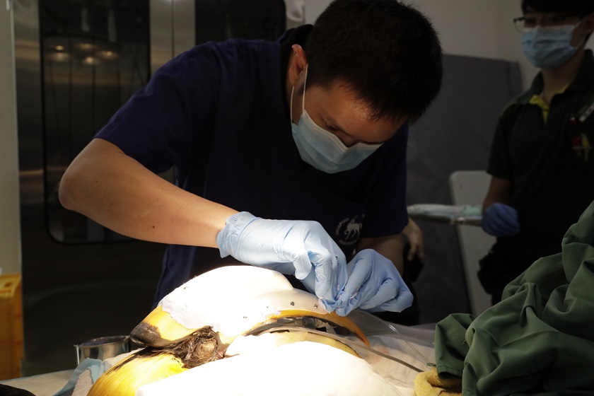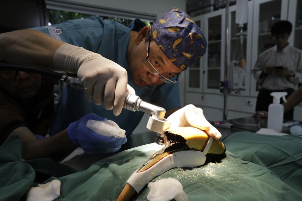 Honorary consultant Dr Hsu Li Chieh from The Animal Clinic, in the process of removing part of Jary’s casque with an oscillating saw.