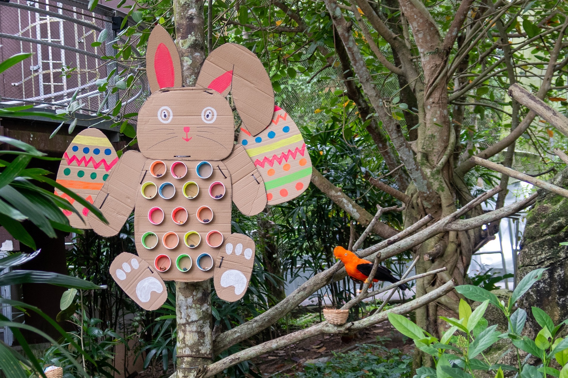 A cutout of an Easter bunny, created from recycled cardboard by keepers at Amazonian Jewels, holds treats for the birds.