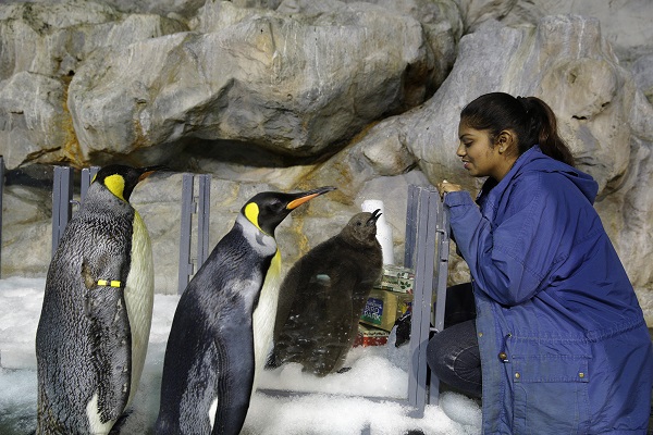 Image: One of two-month-old Maru’s human carers, junior avian keeper Benazir Begum, looks on lovingly with a pair of adult King Penguins.