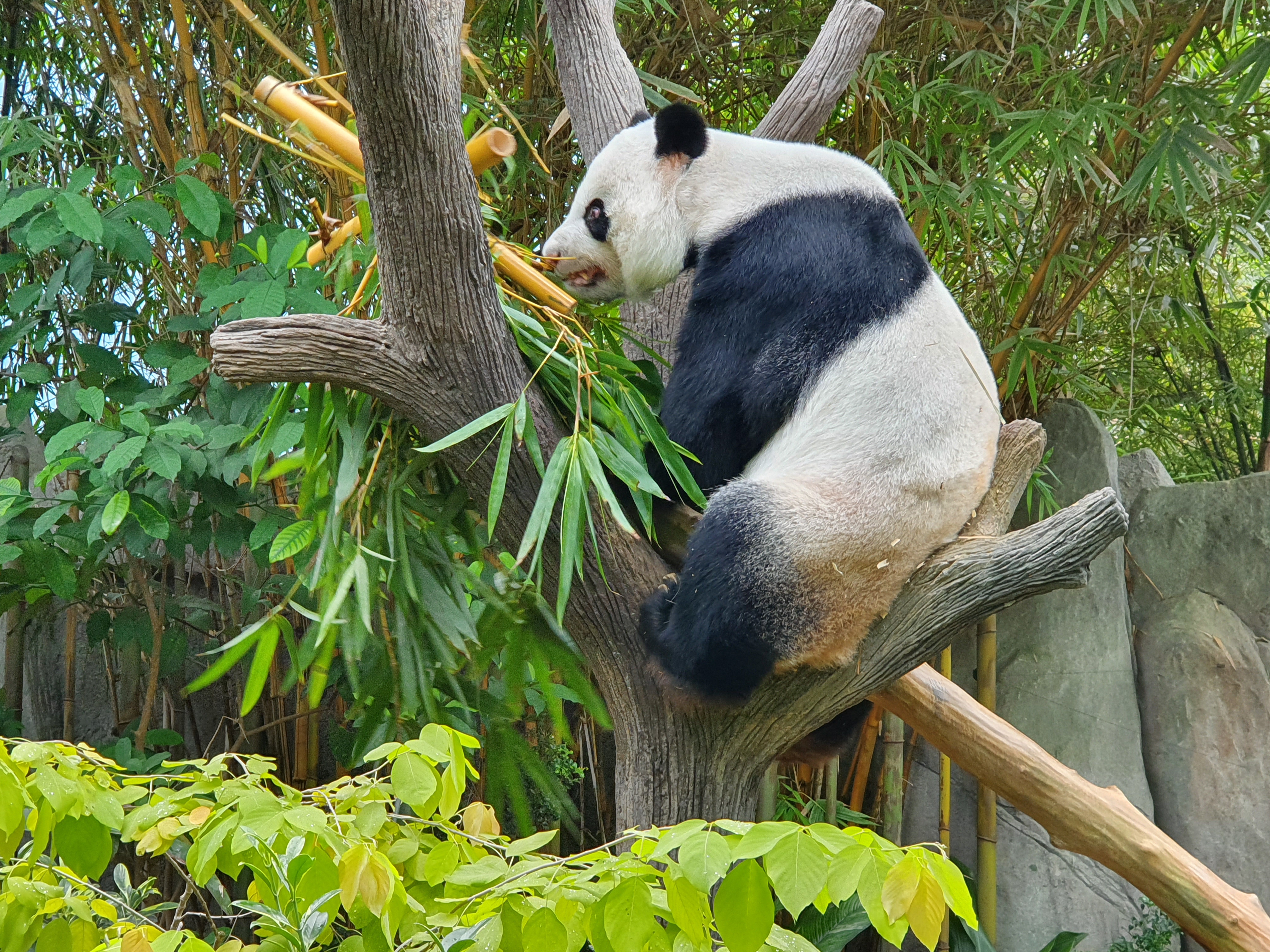 Male panda Kai Kai enjoying a meal of bamboo in River Safari’s Giant Panda Forest while Jia Jia bonds with their newborn cub in an off-exhibit den.