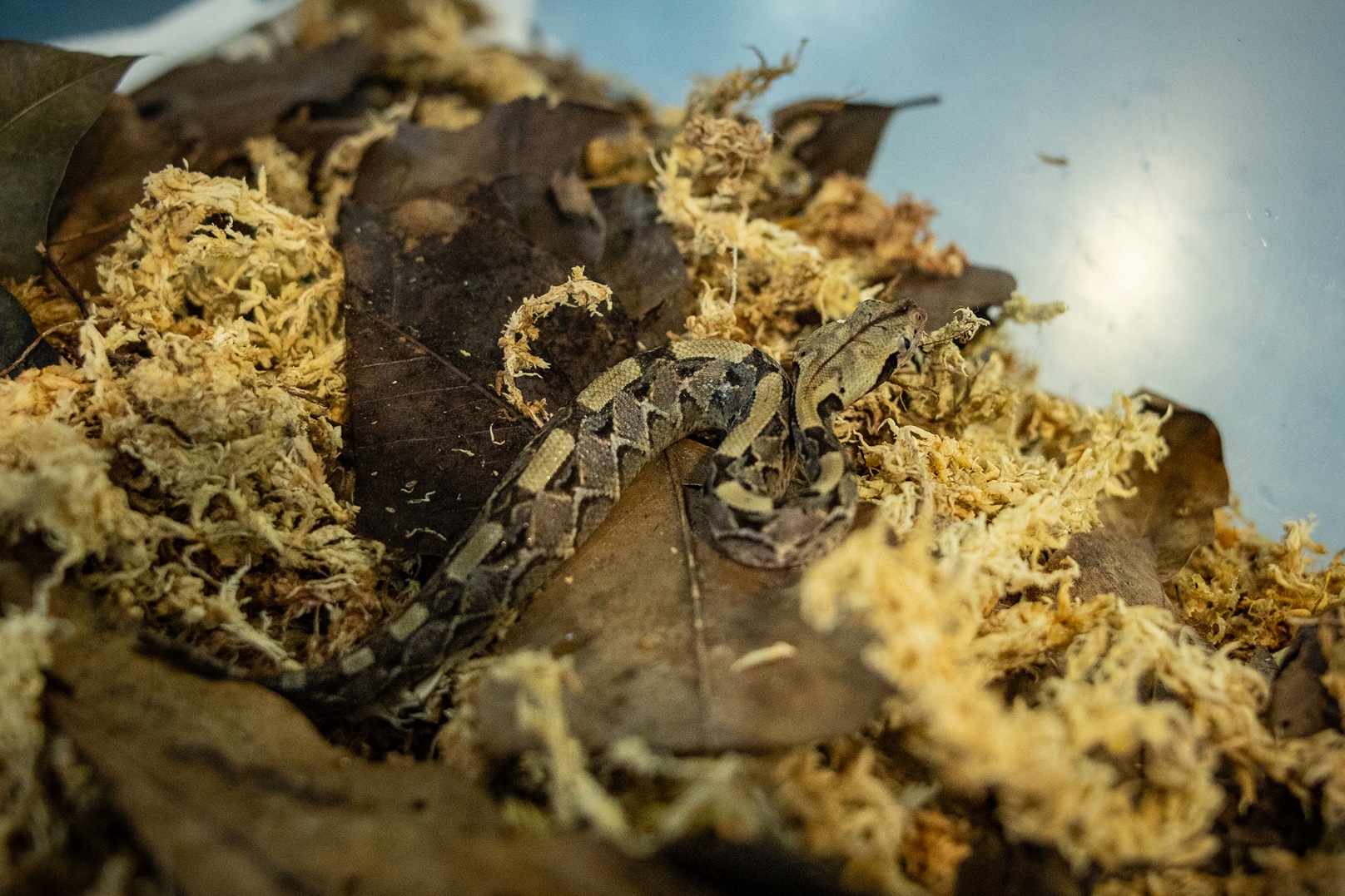 Slithering to more good news, RepTopia celebrated the birth of 13 western gaboon vipers on 12 May 2025, the first births in about a decade. Breeding in this species is triggered by seasonal changes, which the team replicated through a misting schedule that mimicked dry and wet periods. Optimal heating and lighting conditions were also in place, and feeding frequency for mum was reduced in line with its natural behaviour during breeding season. Gaboon vipers are ovoviviparous, meaning they give birth to live young after eggs hatch internally. This clutch includes five males and eight females, distinguishable by the males’ longer tail. These snakes are venomous from birth and possess the longest fangs among venomous snakes.
