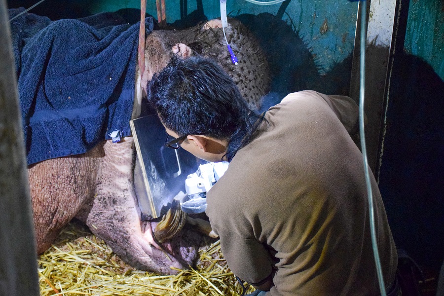 Kassim, Night Safari’s 21-year-old Nile Hippopotamus faced the problem of an overgrown canine that pierced through his upper lip. Nor Sham, Senior Veterinary Nurse, WRS, uses a mechanical saw to trim off a portion of the overgrown tooth. Overgrown teeth in hippopotamuses can make it difficult for them to close their mouths and chew their food properly. Keepers look out for signs of potential dental issues in their animals which include spitting out their food, eating slower or favouring one side of the mouth when chewing. Animals with dental issues may also avoid eating harder foods and favour softer items.