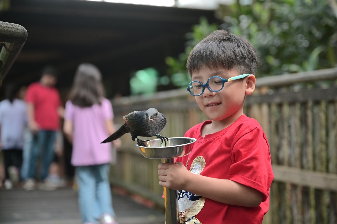 One highlight of Jurong Bird Park is its feeding sessions, which allowed guests intimate and interactive avian encounters. Here, a young boy enjoys the experience of having a friendly bird perch on the feeder for a treat.