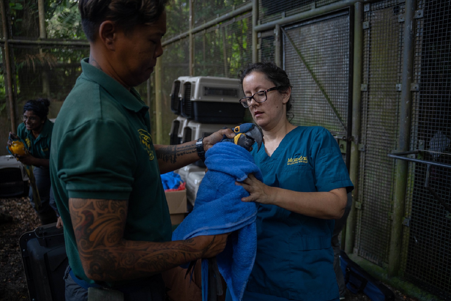 Each bird is assessed by the veterinary team to determine if it’s fit for move before the transfer. This includes looking out for the bird’s feather conditions and body condition, as well as weight taking. Here, a Hyacinth Macaw is being checked by Dr Ellen Rasidi, veterinarian, before Peter Teo, Deputy Head Keeper, Animal Care, puts it into the pet box for transfer to Bird Paradise.