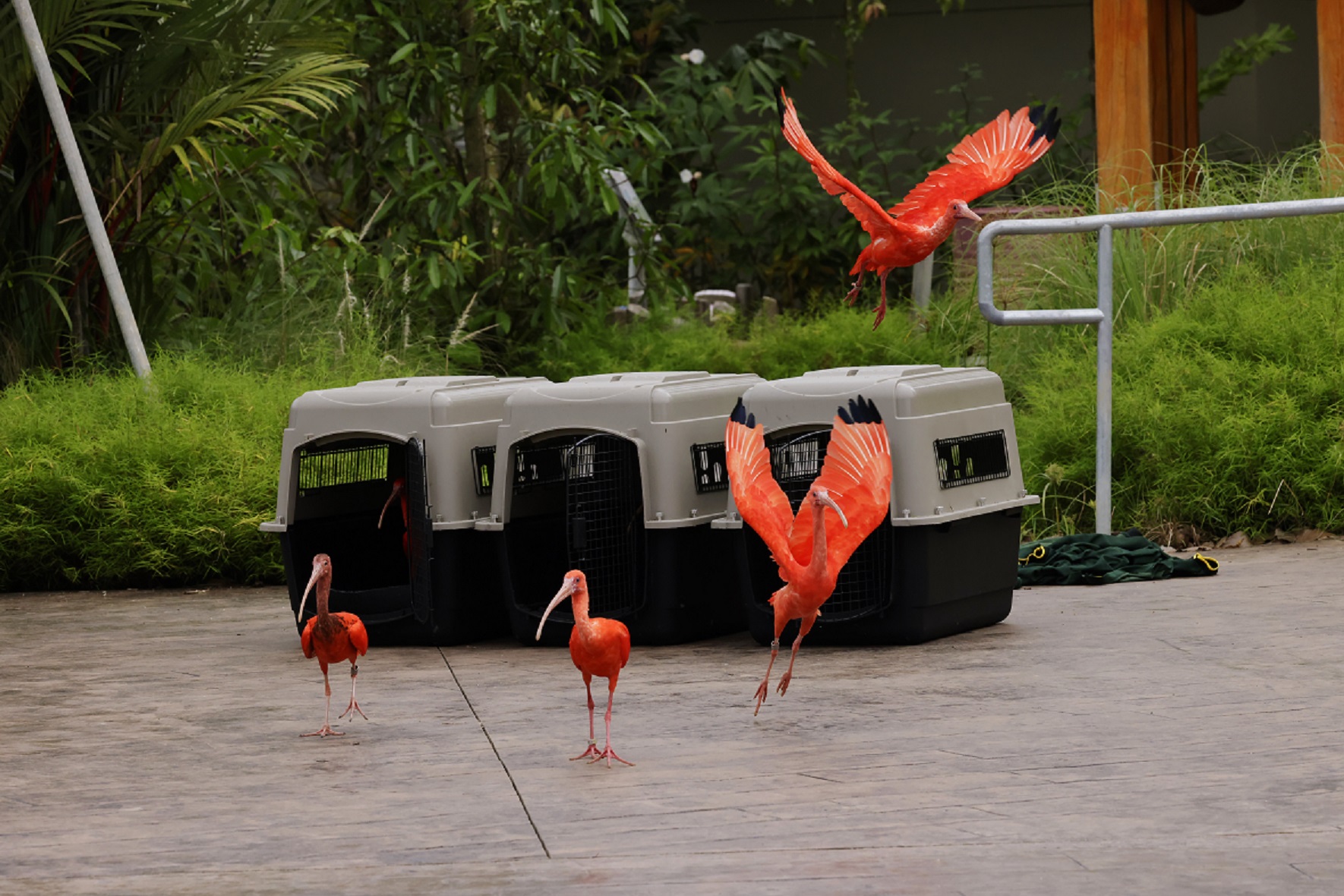 Scarlet ibises released from the pet boxes into Hong Leong Foundation Crimson Wetlands.
