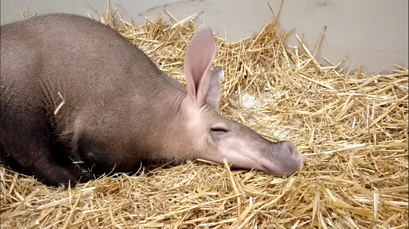 Alika the aardvark snoozing in her bed of hay during her month-long quarantine. As a nocturnal mammal, she spends most of the day sleeping and wakes up in the evening or night.