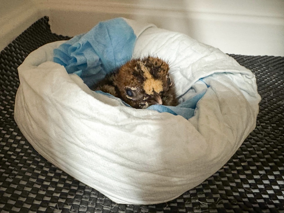 The newly hatched chick was moved to a nursery brooder for warmth and housed securely in a chick guard, or “donut”.
