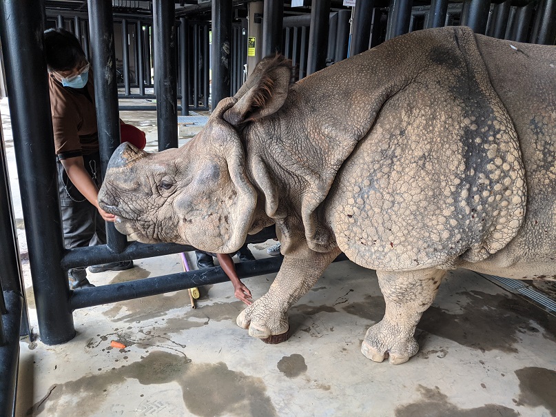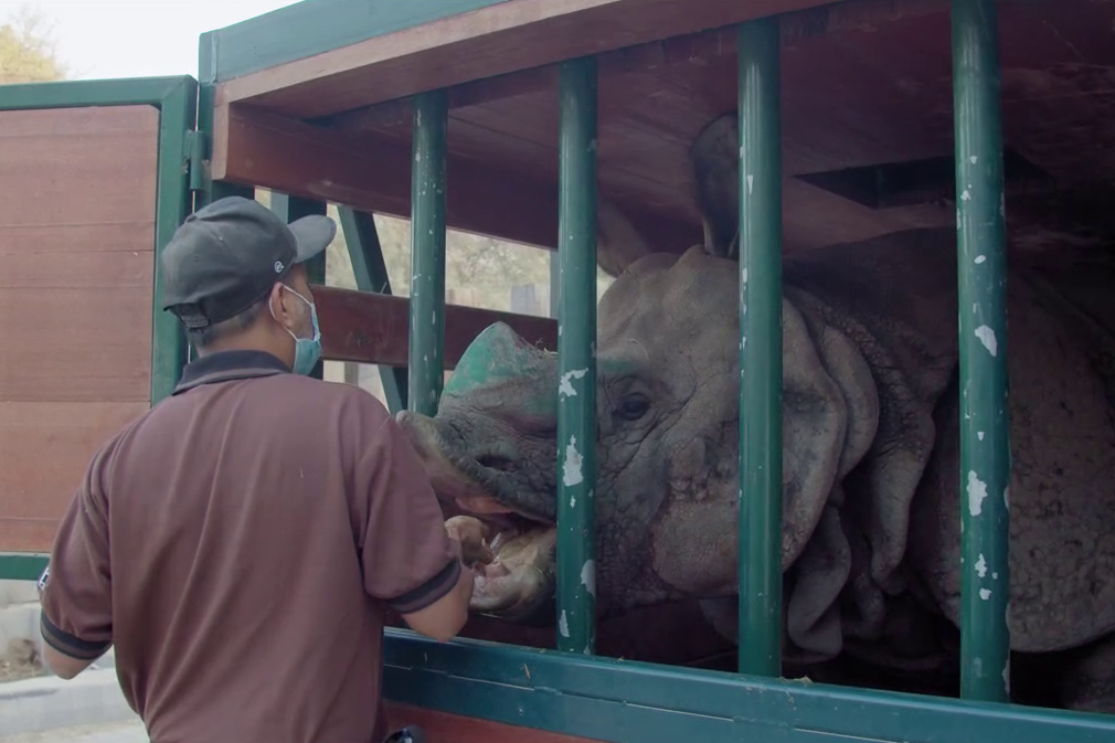 Working through travel restrictions and quarantine requirements amidst the pandemic, Wildlife Reserves Singapore’s (WRS) Assistant Curator of herbivores, Yusoff Man, travelled to the UAE in early October 2020 to facilitate the successful transfer. He worked closely with the animal care team at Al Bustan Zoological Centre to learn about Thulie and Newari’s characteristics and care needs to ensure a smooth transition for the brothers. Of the brothers, Thulie is bolder, and more food motivated while the younger Newari is more cautious and shyer. Moving Thulie at 1.9 tonnes and Newari at 1.7 tonnes was a mammoth task that required team effort and meticulous planning. Preparations by the Al Bustan and WRS animal care teams started several months before the move and included designing and constructing customised transport crates for the rhinos. This continued well into Yusoff’s arrival in Dubai where he assisted the animal care team in conditioning the rhinos to voluntarily enter their transport crates. Food treats were used to incentivise the animals as these helped them to feel comfortable as they become familiar with the interior of the crates. Throughout the 8-hour flight from Dubai airport to Singapore, Yusoff travelled with the gentle giants and kept them calm in their transport crates by periodically feeding them fruit and water. The rhinos arrived safely in Singapore and Night Safari on 2 November 2020.