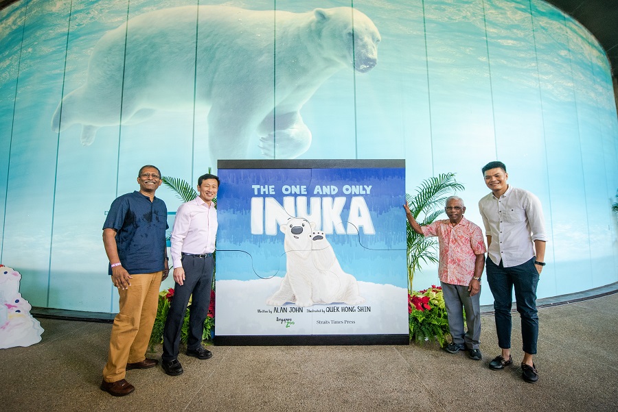 Inuka the world’s first polar bear born in the tropics, is immortalised in a picture book about his life. ‘The One and Only Inuka’ book, published by Straits Times Press, was launched at Singapore Zoo this morning, on what would have been his 28th birthday. Inuka passed on in April this year. From left: Author Mr Alan John, Minister for Education Mr Ong Ye Kung, Chairman of Mandai Park Holdings Mr S Dhanabalan, and Illustrator Mr Quek Hong Shin.