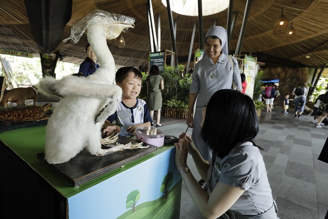 River Safari’s young Eco-rangers from Canossaville Preschool conducting a public book-reading of the book “Little Otter, Litter Trouble” a bilingual storybook published by WRS’ Education department with support from the Lee Kuan Yew Fund for Bilingualism. Limited copies will be available for guests who complete the trail and booth activities in October.