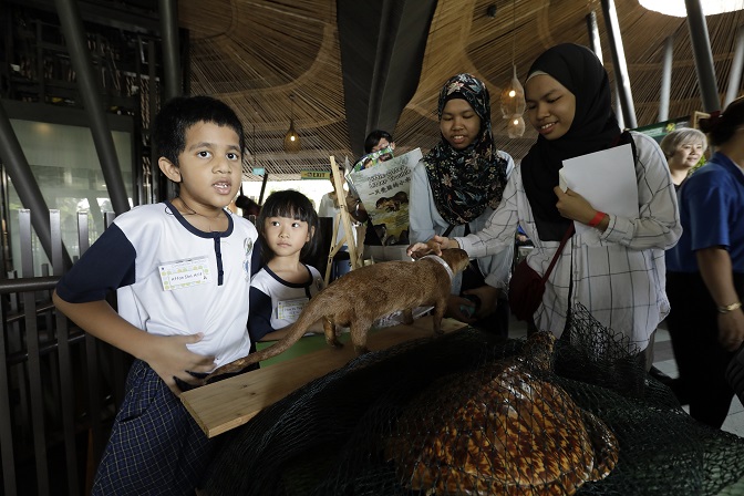 River Safari’s young Eco-rangers from Canossaville Preschool sharing about the dangers of plastic waste posed to wildlife using an otter specimen with a plastic bag stuck on its neck.