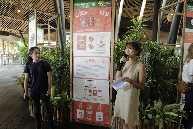 Students from Nanyang Polytechnic presenting their idea that won first place in the Sustainability Design Competition—Turtlery—a food delivery service that incentivises users to opt out of single-use packaging by offering heavy discounts and donations to a cause of their choosing.