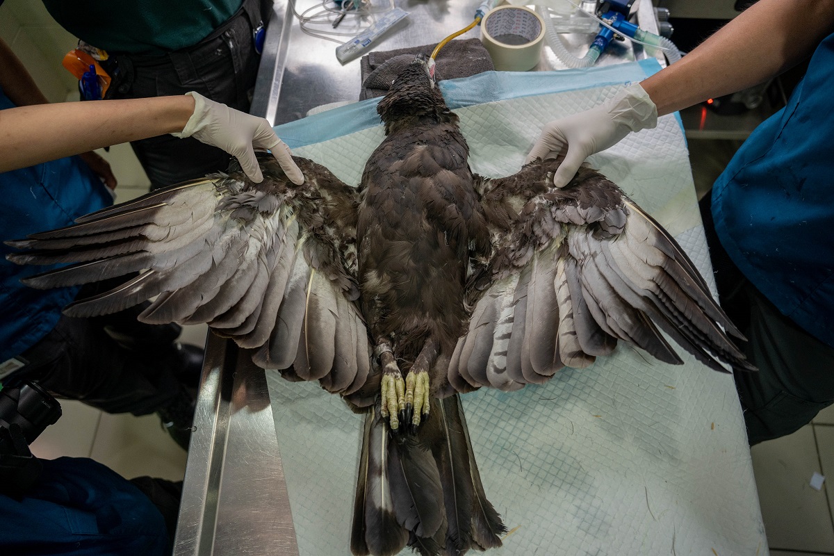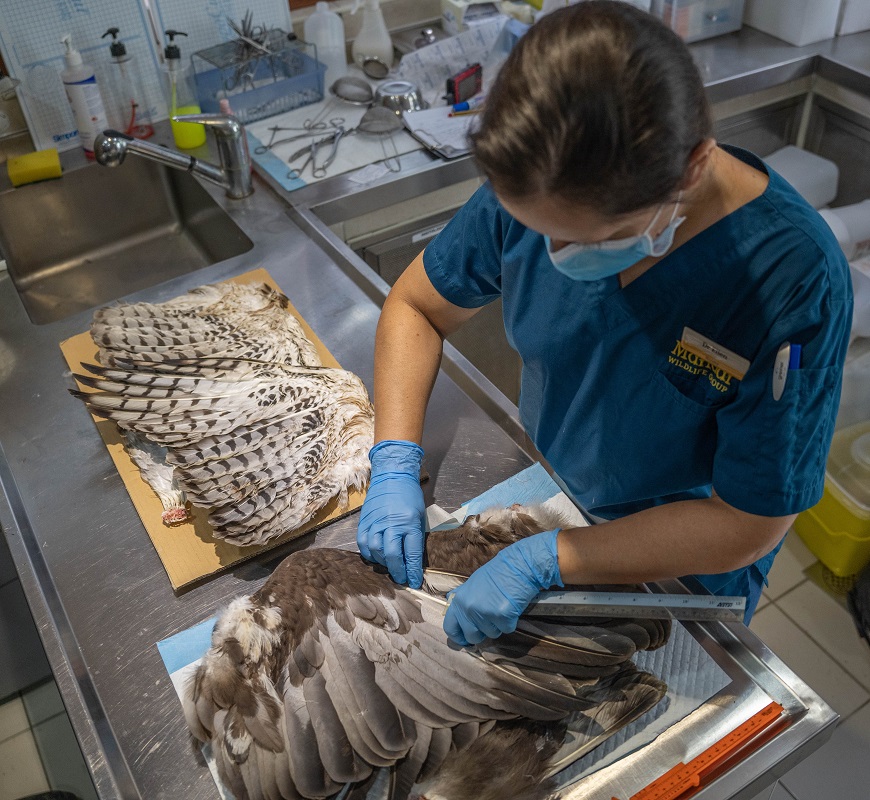 Dr Ellen Rasidi tests the fit of one of the donor’s secondary feathers on the bird’s right wing. It was a painstaking process of replacing over 50 feathers on the bird’s wings and tail.