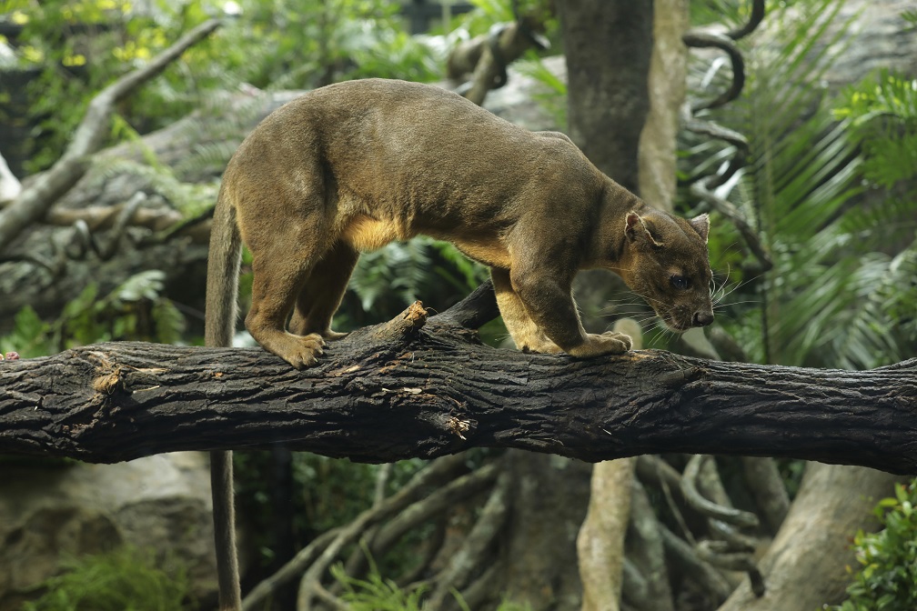 The exhibit is also inbuilt with features that replicate the fossa’s natural habitat to improve both animal welfare and guests’ viewing experience. Guests can watch the fossa maneuver expertly around dynamic branches that sway with its weight, helping to enhance its sense of balance and muscularity.