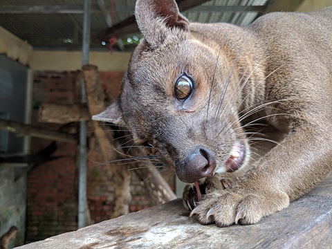 Kabibi, Singapore Zoo’s five-year-old female fossa eating in her den.