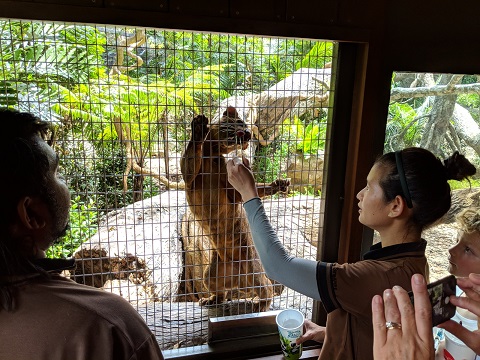 As part of Singapore Zoo’s latest exhibit design philosophy with guest interactivity in mind, the fossa exhibit features a sliding panel that opens up into a meshed window. Guests can get up close to the fossa while keepers conduct conditioning sessions.