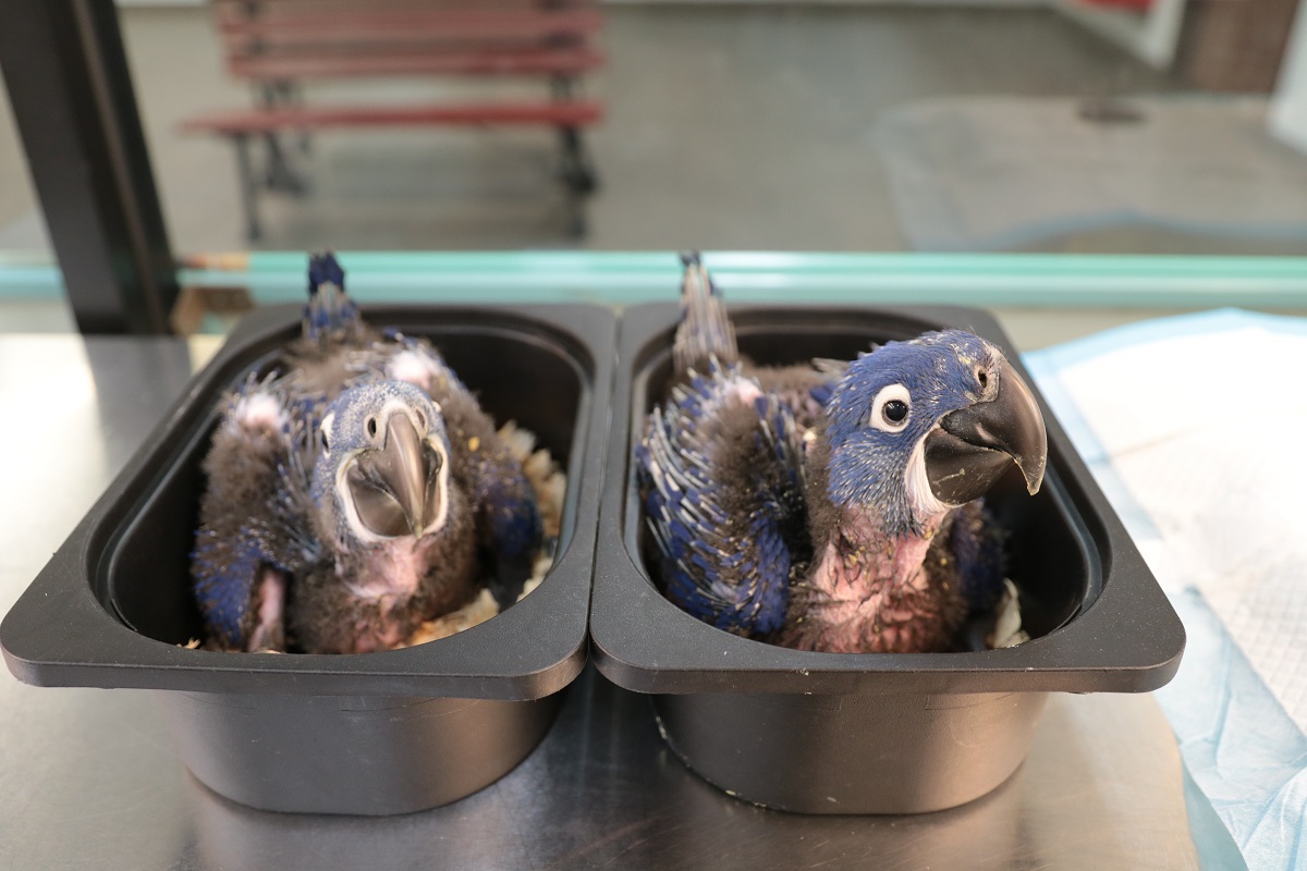 A pair of hyacinth macaws that were hand-raisedin Jurong Bird Park’s Breeding & Research Centre. The parkwelcomed five hatchlings of the vulnerable parrot in 2019.