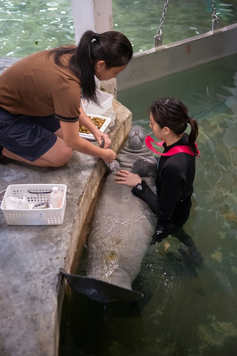 River Safari’s aquarists (from left)Joan Tan and Dona Loh conducting medicalconditioning on a manatee calf to get theanimal used to future medical proceduressuch as blood draw. River Safari saw threeWest Indian manatee calves born in 2019.