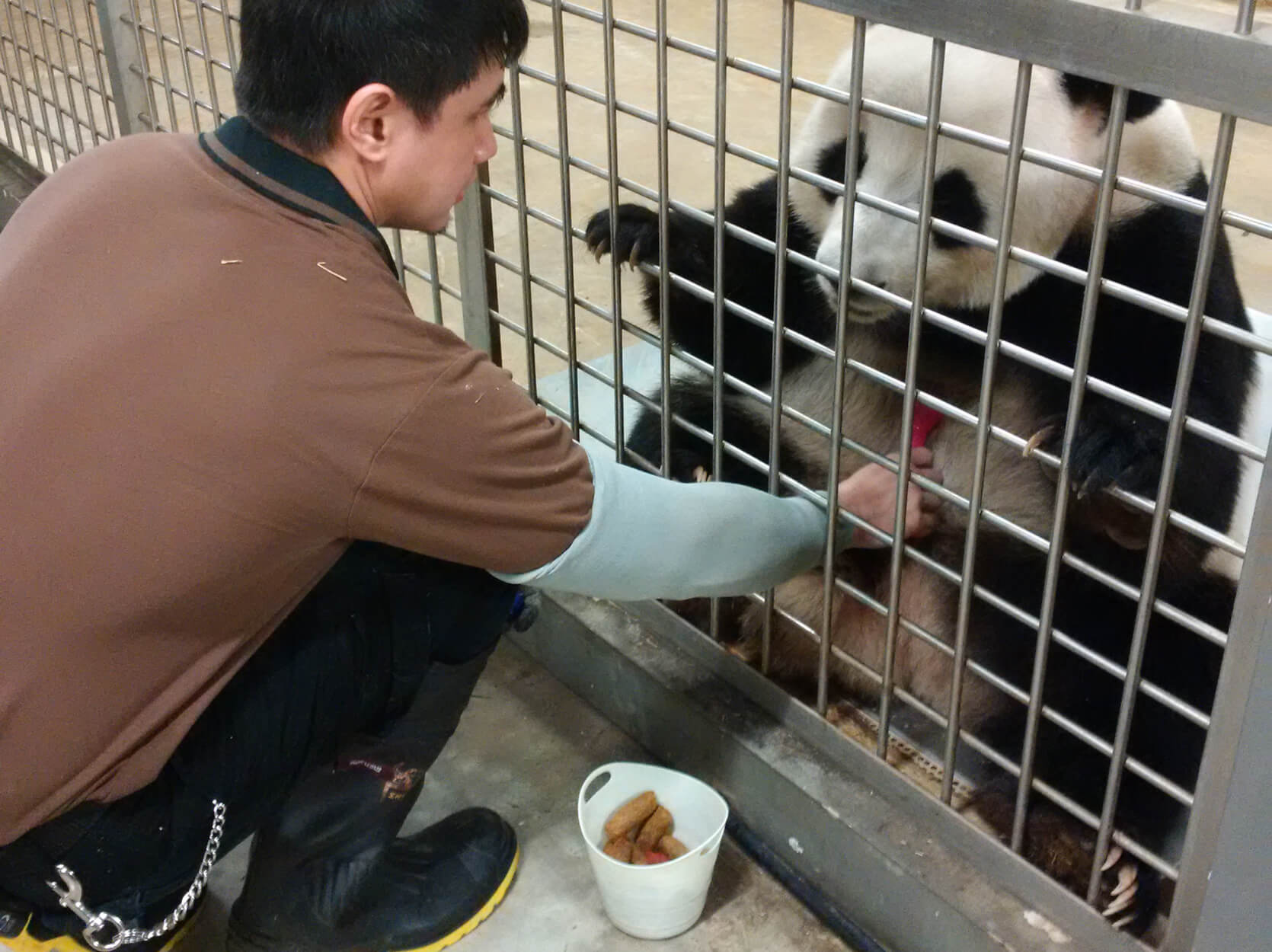 Animal Care Officer, Andre Taleon, retrieving the ‘cub’ from Jia Jia. Should Jia Jia be pregnant, this conditioning will allow keepers to safely retrieve the cub from Jia Jia, for health checks and general care.