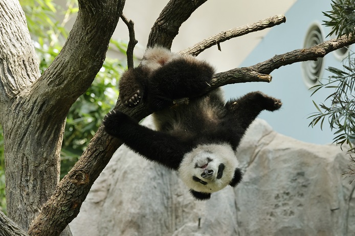 Spot adorable Le Le with mom Jia Jia in their shared exhibit at Giant Panda Forest and watch him scale trees effortlessly or bond with mom over enrichment items lovingly prepared by their care team.