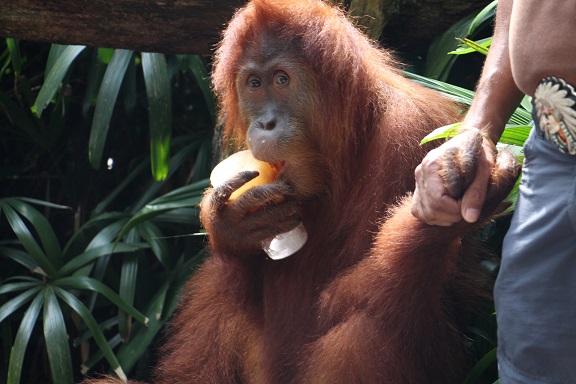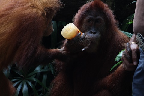 Cheeky Ah Meng does not seem too keen on sharing her birthday treat with her playmate Putra. The celebration took place during the daily orangutan token feeding and photography session at 11.00am, where visitors get the opportunity to take photos and learn more about these precious animals.