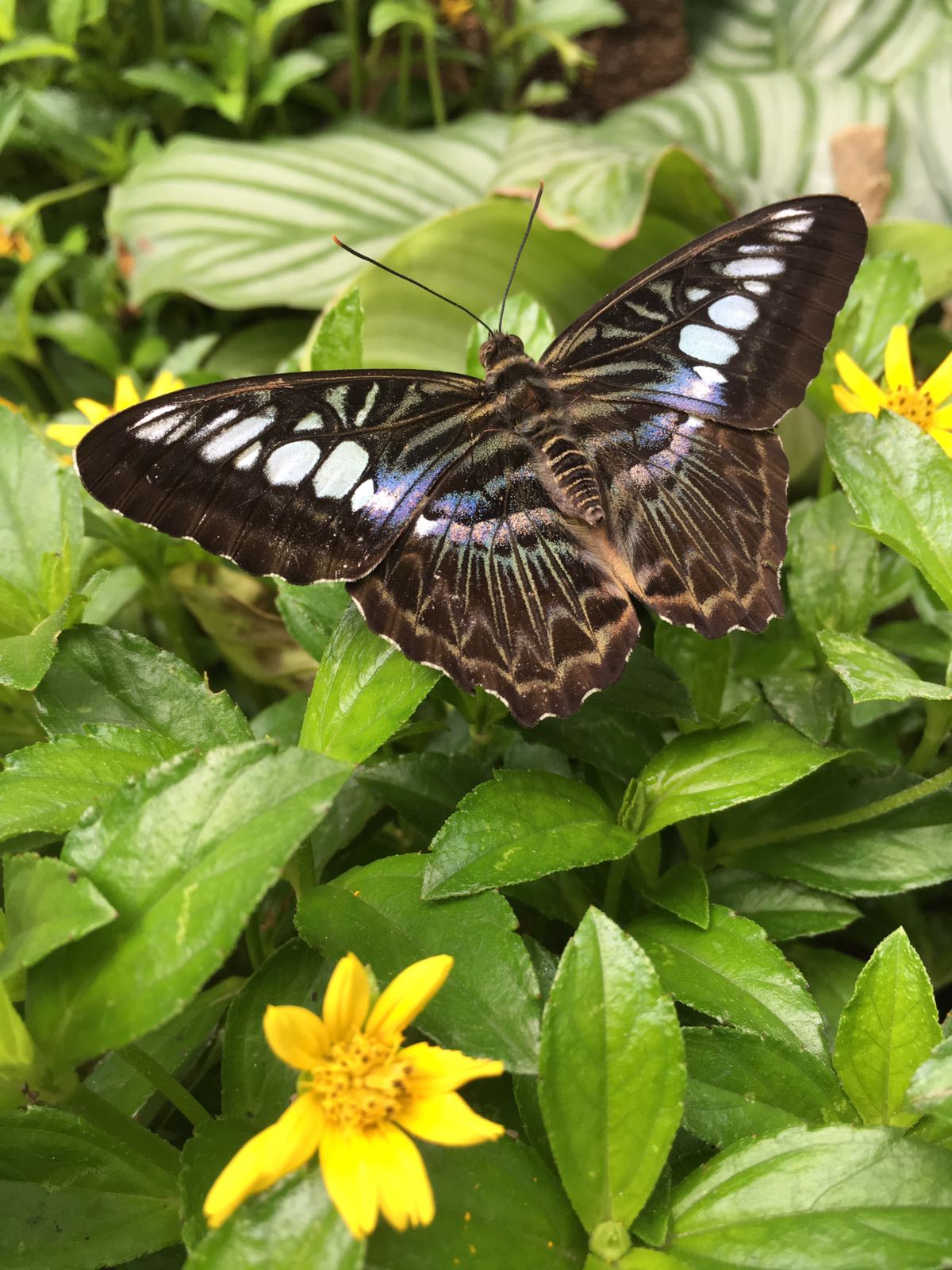 Butterflies taking a rest on a visitor’s hat. While butterflies may land on guests, visitors are encouraged not to reach out and touch them as improper handling may damage their wings.