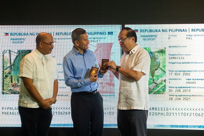 Minister for Foreign Affairs Vivian Balakrishnan (centre) receiving the passports of Philippine eagles Sambisig and Geothermica from His Excellency Joseph Del Mar Yap (extreme right) while Philippine Assistant Secretary for the Department of Environment and Natural Resources Mr Ricardo L. Calderon (extreme left) witnesses the exchange. Celebrated as the national bird of the Philippines, Sambisig and Geothermica are the first breeding pair to be established outside of their native country as part of a recovery plan.