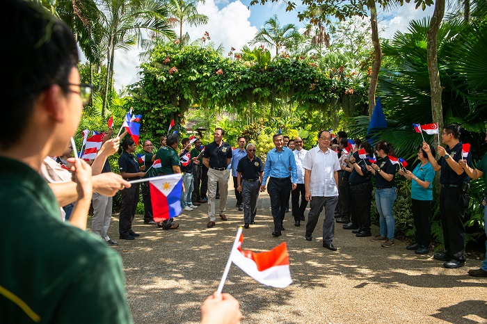 Minister for Foreign Affairs Dr Vivian Balakrishnan (centre, in blue shirt) and Philippine Assistant Secretary for the Department of Environment and Natural Resources Mr Ricardo L. Calderon (second from right in white shirt) were warmly welcomed by a wave of Philippine and Singapore flags as they arrived for the official debut of the Philippine eagle exhibit at Jurong Bird Park this morning. The launch also marks the Golden Jubilee of diplomatic relations between Singapore and the Philippines in 2019.