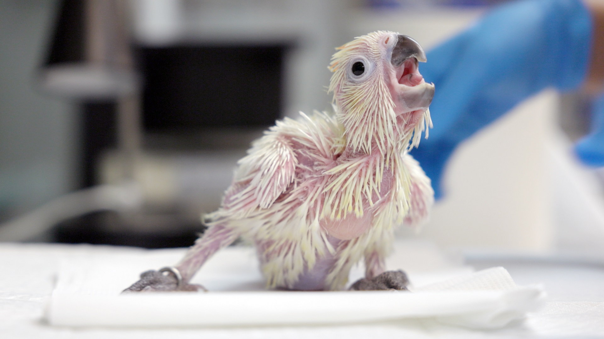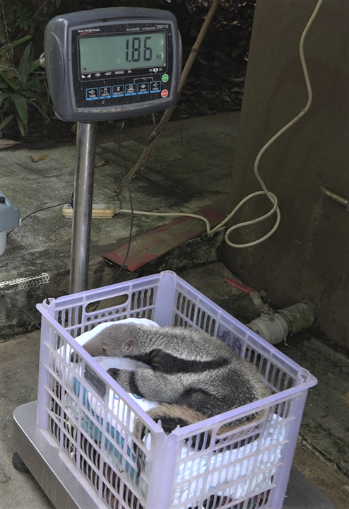 A Giant Anteater pup being weighed at about a week old. All babies receive health checks and are monitored closely to make sure they grow up healthy and happy