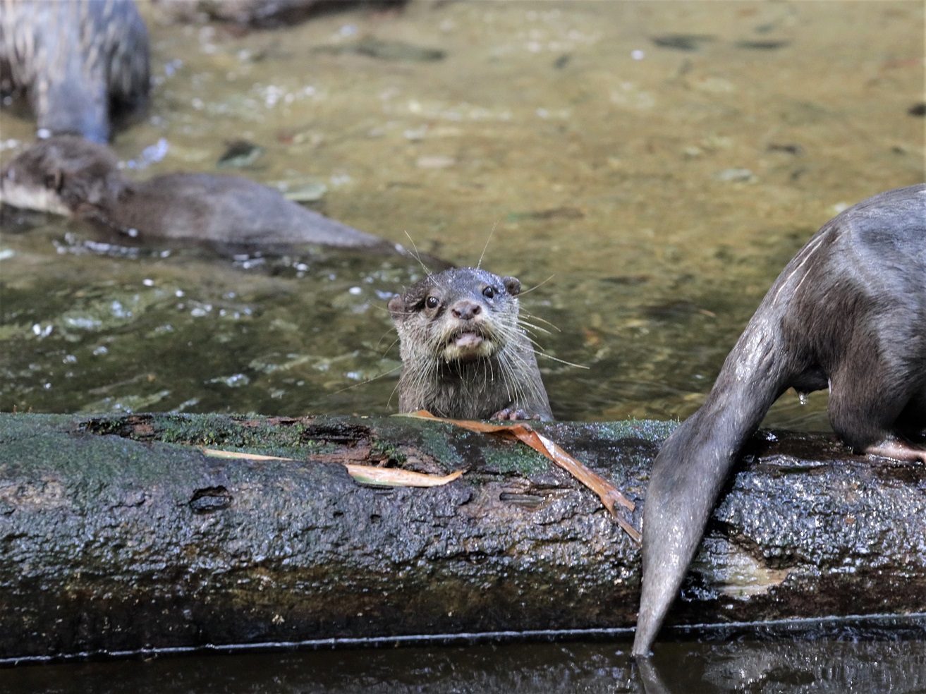 One of the three Oriental Small-clawed Otter babies from 2022 peeking out during family fun in the waters. Air pockets within their coat keep them insulated while they swim.