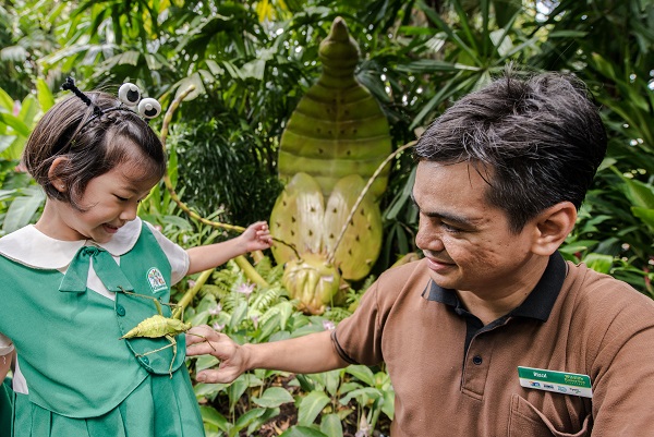 Image 1: Rizal Bakar, Senior Keeper of Invertebrates, introduces a young friend from Kinderland to a jungle nymph while its supersized 3D cousin looms behind. This holiday season, Singapore Zoo and River Safari promise some super-sized fun. At Singapore Zoo, larger-than-life invertebrates await at the Land of Giants Trail. Uncover intriguing facts about these fascinating creatures as you marvel at supersized 3D installations, and meet the real life little heroes during keeper interaction sessions at the Zoo.