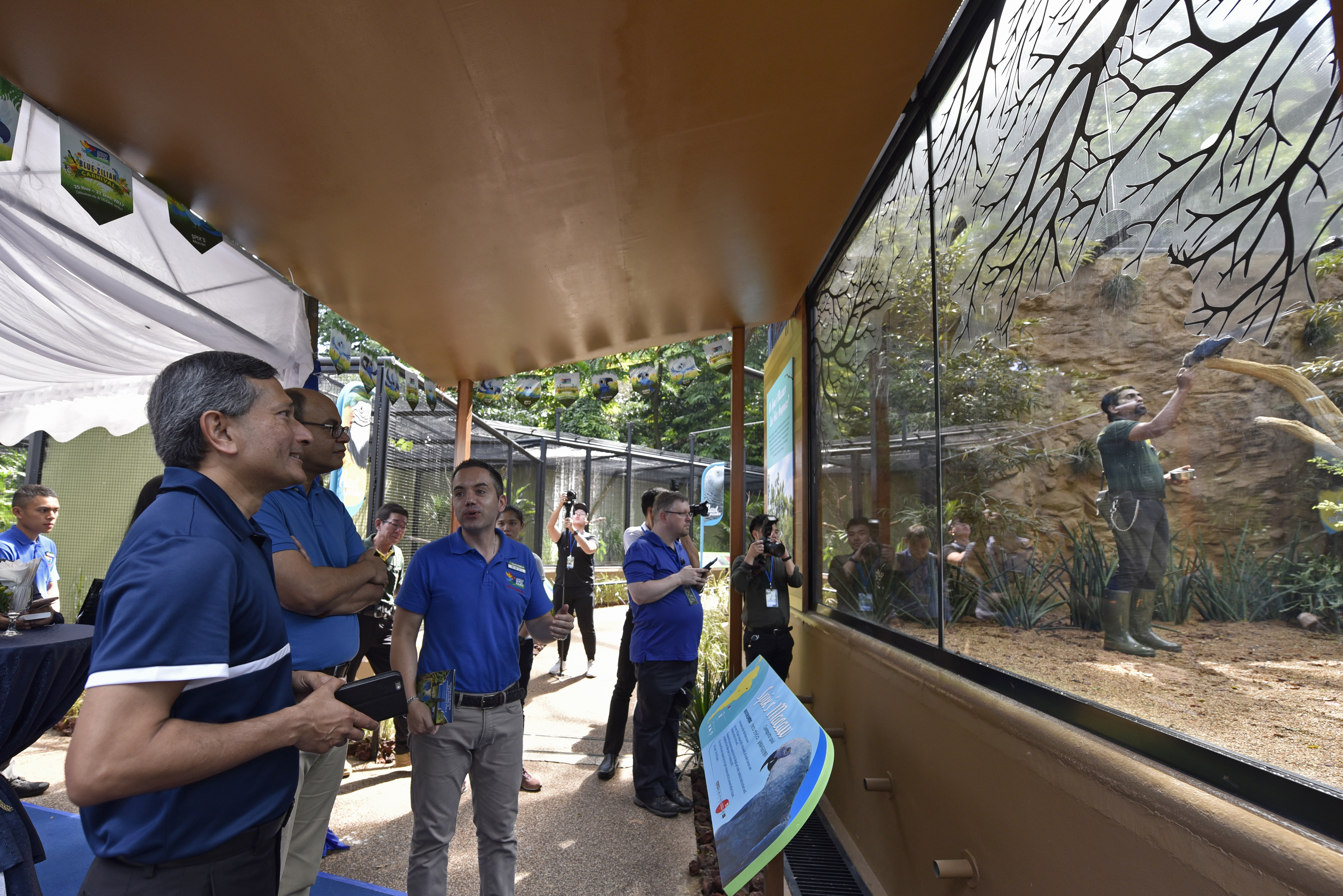 Minister for Foreign Affairs Vivian Balakrishnan admiring the critically endangered Spix’s Macaw at the Official Opening of Jurong Bird Park’s Parrot Paradise exhibit this morning. The opening also marks the golden jubilee of diplomatic relations between Brazil and Singapore.