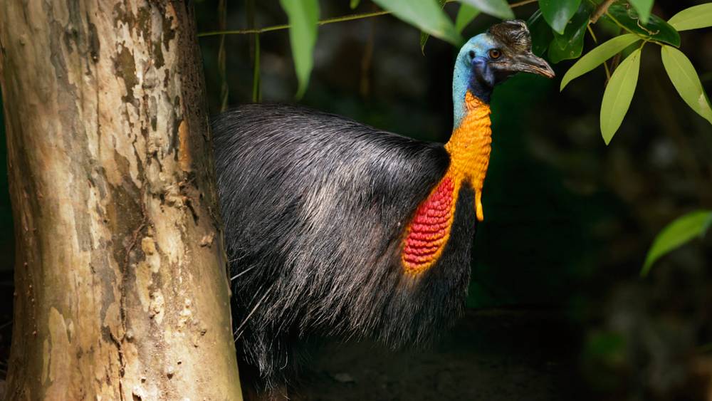 This flightless fowl can run at 50 kilometers (30 miles) per hour through dense undergrowth, leap 2 m (7 ft) into the air, and even swim. Unlike its cousin the Emu, it is shy, solitary and seldom seen in its forest home, where it forages for fallen fruits.