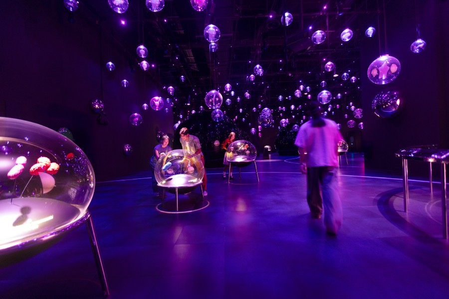 Flip the lens entirely. Illuminated glass orbs, interactive domes and projection screens bring the hidden ecosystems of slime mould, tardigrades, plankton, and bees into vivid, giant-scale view. These are organisms normally invisible to the naked eye — and here, you'll find yourself immersed in them. Interact with the orbs to collectively trigger spectacular reactions in the towering centrepiece globe.