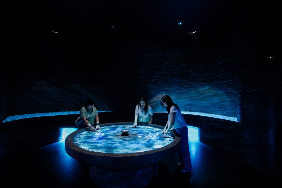 Enter a reflective, kaleidoscopic cave that transitions into a breathtaking underwater world. Reactive screens unveil marine life all around you, and a wristband interaction triggers one of nature's most extraordinary phenomena: coral spawning.