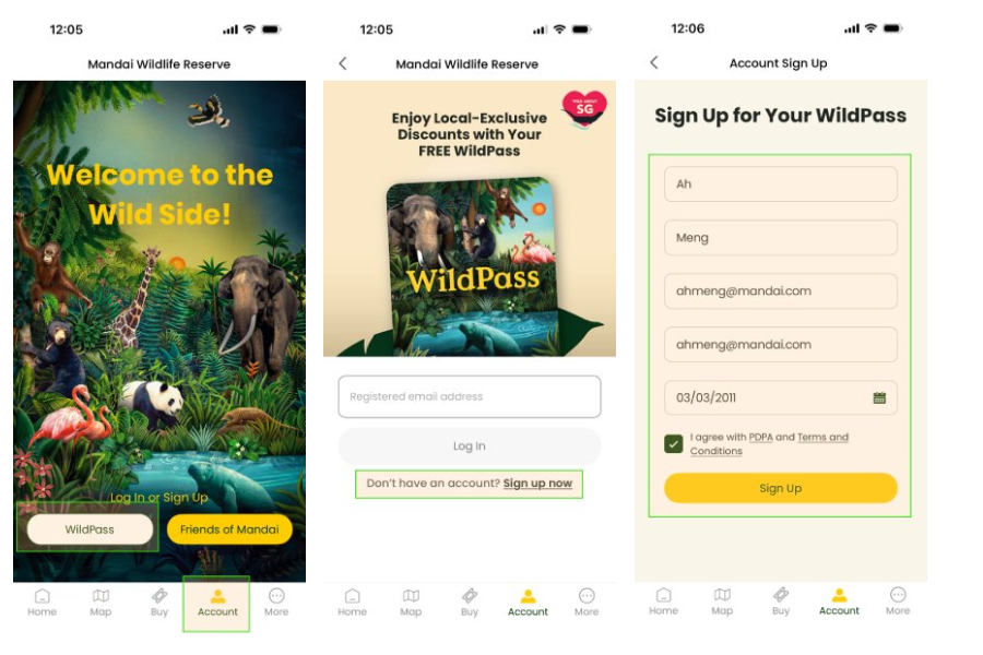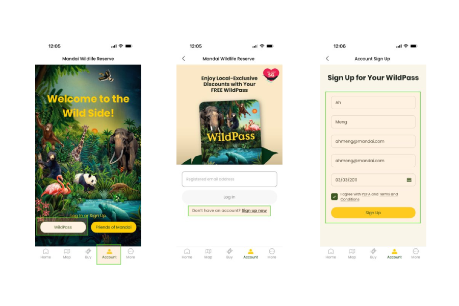 Already have the Mandai app installed? Simply toggle to 'Account' and tap 'Sign Up Now' to register your WildPass account directly from your mobile device. You'll receive your digital card in minutes—making it the fastest way to get started on the go.