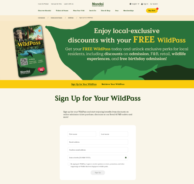 Ready to start saving on your Mandai Wildlife Reserve adventures? Sign up for WildPass now and unlock your exclusive benefits immediately. Whether you're planning your next visit or just want to be ready when the mood strikes, WildPass ensures you never miss out on exciting deals and unforgettable wildlife experiences.