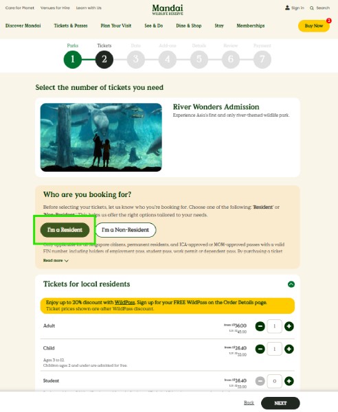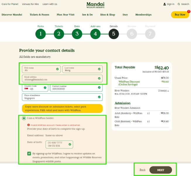 When buying admission tickets on mandai.com, select "I'm a Resident" at Step 2 (Tickets) to unlock WildPass-discounted ticket prices. At Step 5 (Details), fill in your contact details and check "I am a WildPass holder" — then enter your date of birth and consent to receive updates on events, promotions, and happenings at Mandai's wildlife parks.