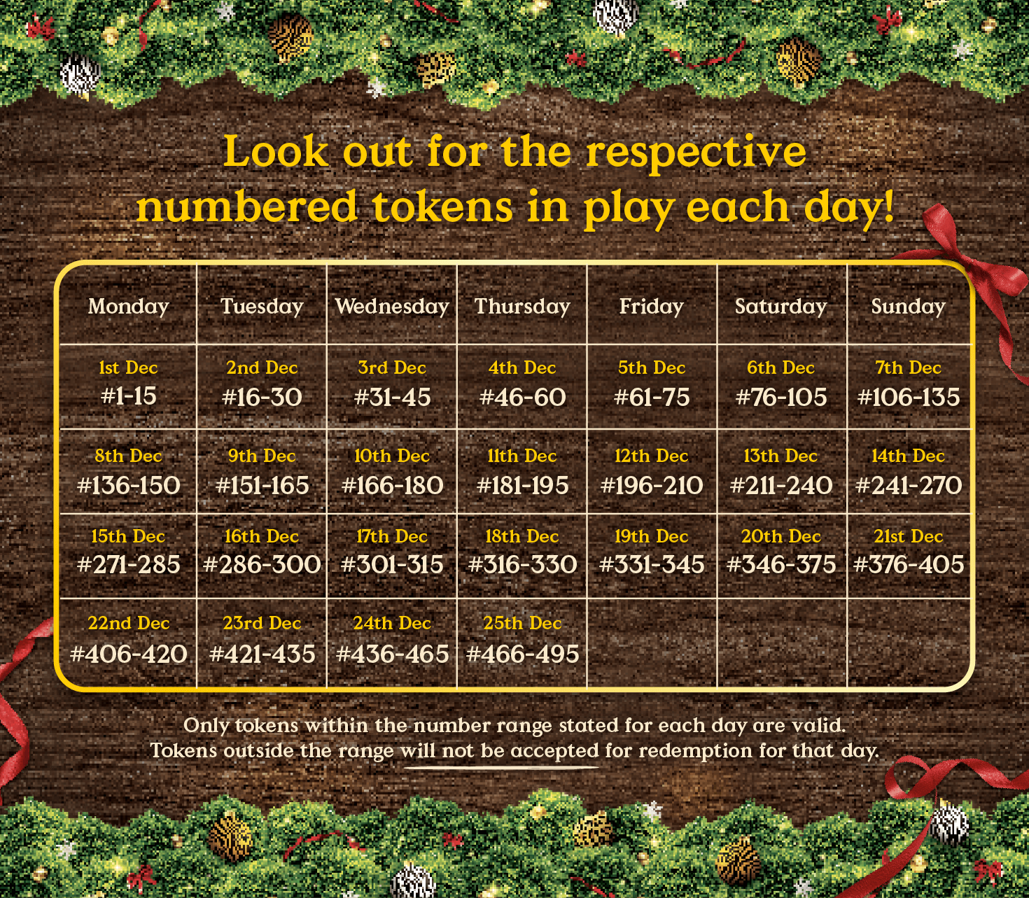 Participants will need to check the respective numbered tokens in play each day to ensure the tokens are valid for redemption.
