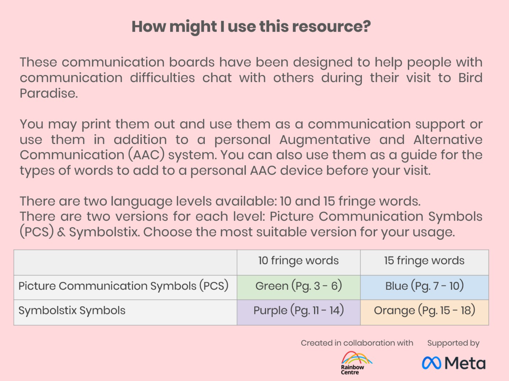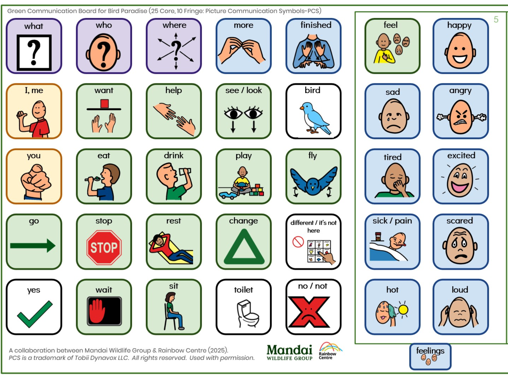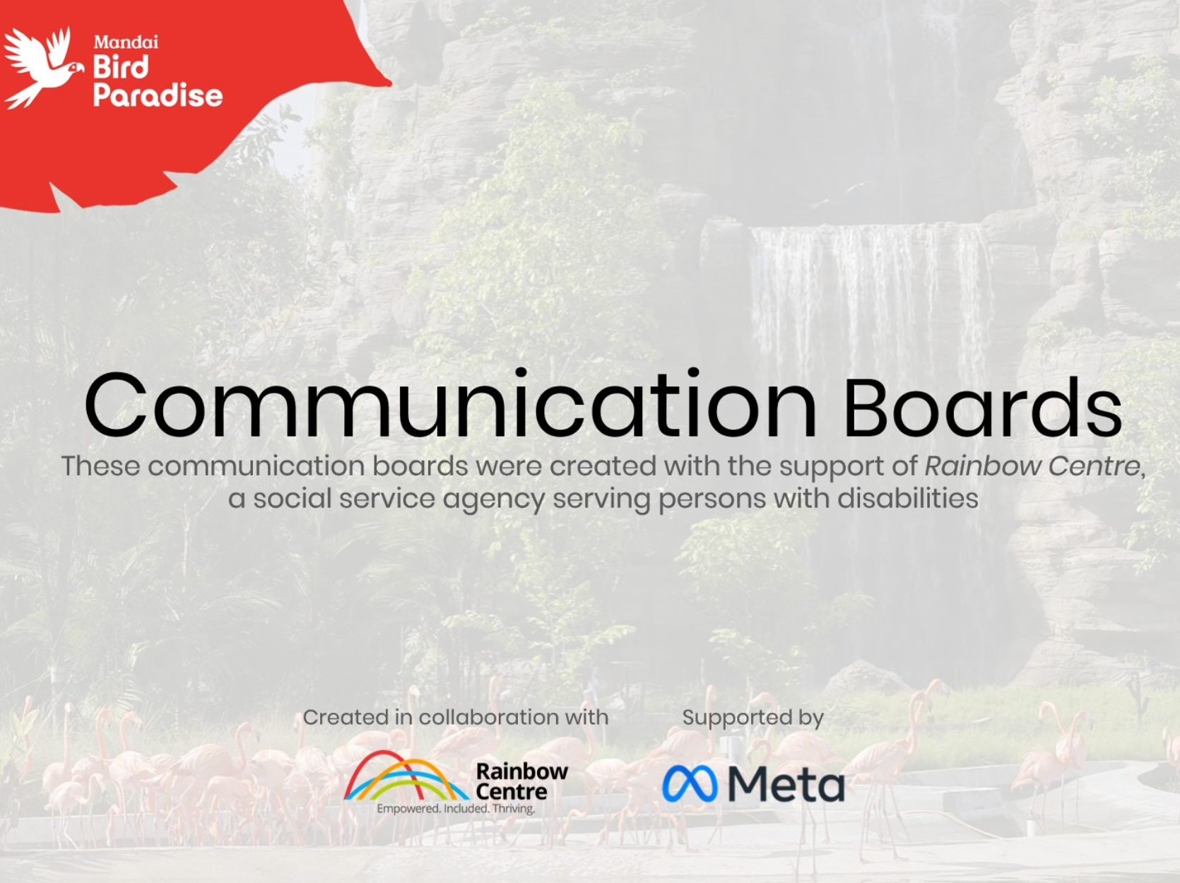 These Communication Boards were developed in collaboration with Rainbow Centre. They are designed to help people who are challenged with verbal communication to connect with others during their visit to Bird Paradise.