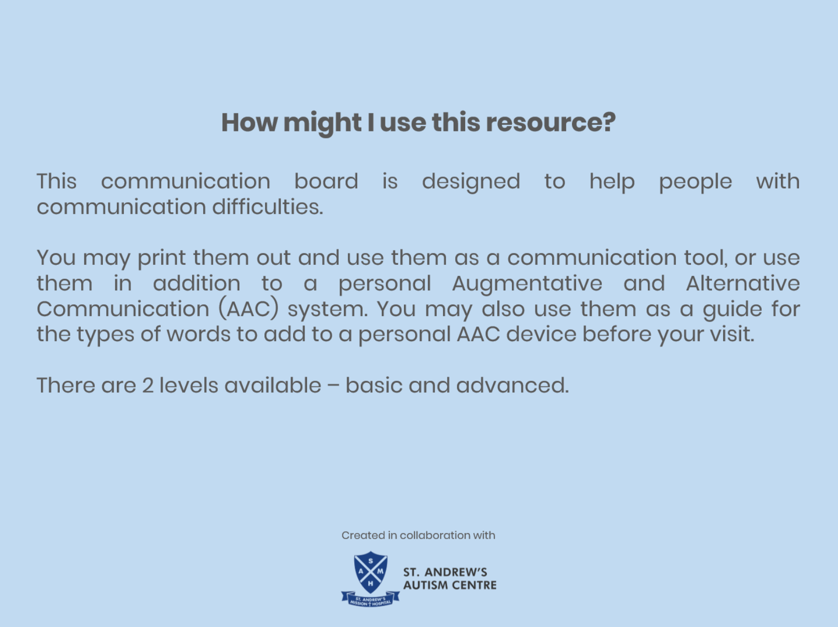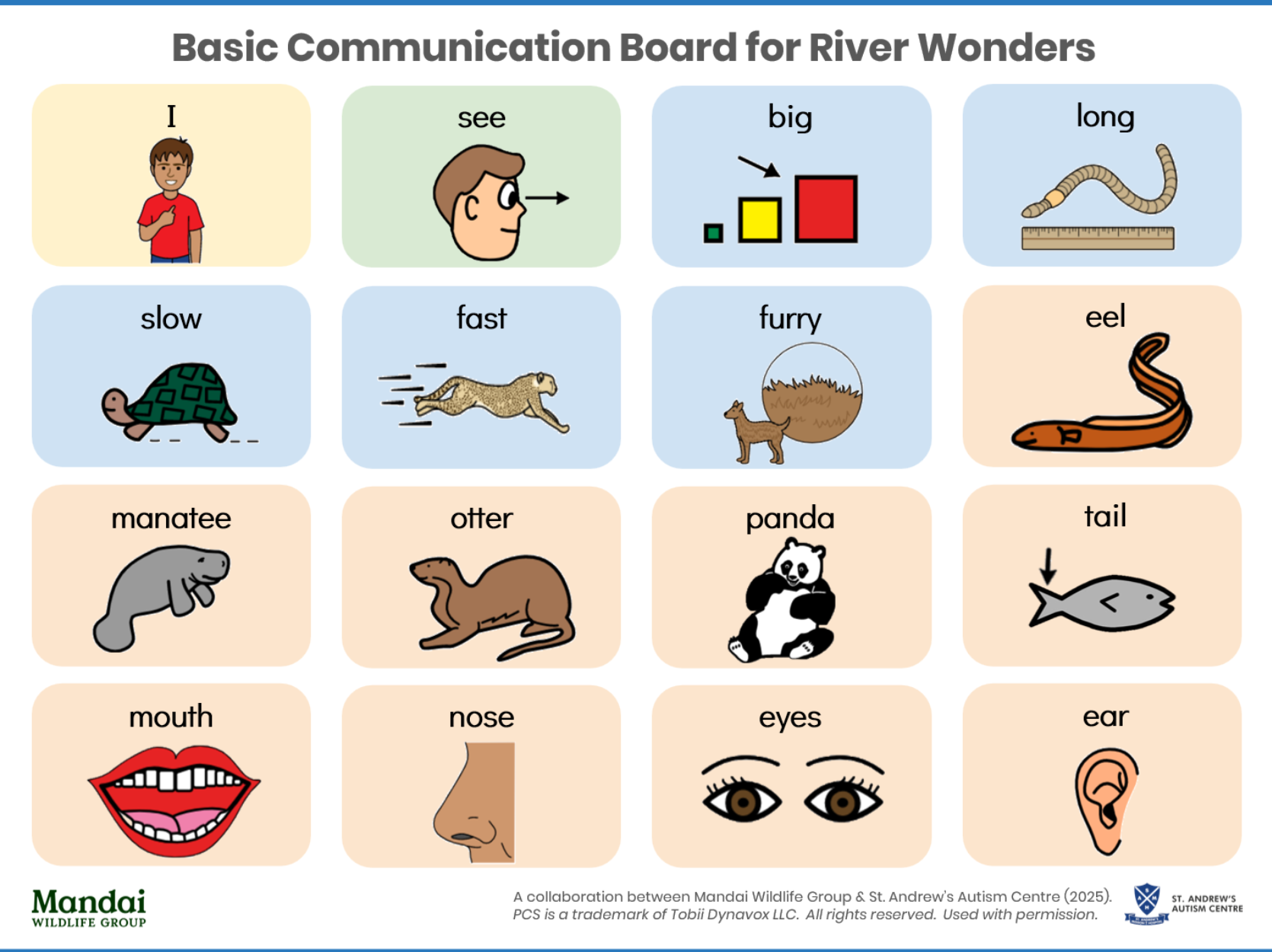 These Communication Boards was developed in collaboration with St. Andrew's Autism School. They are designed to help people who are challenged with verbal communication to connect with others during their visit to River Wonders.