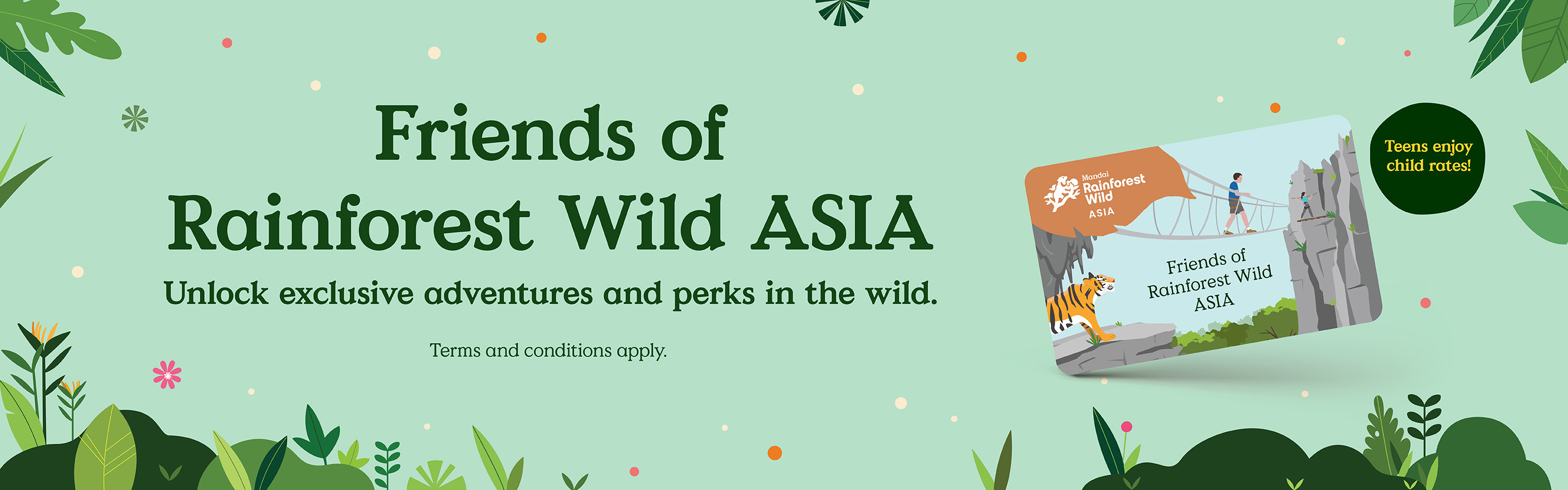 Enjoy annual admission to Rainforest Wild ASIA*. Blackout dates applicable on second day of Chinese New Year, Labour Day and Hari Raya Puasa. Separate admission tickets are required to access Bird Paradise, Night Safari, River Wonders and Singapore Zoo.