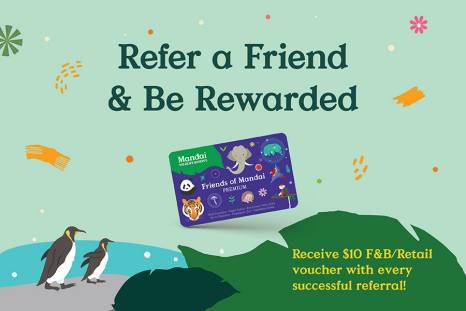 New sign-ups get 15% off Friends of Mandai Premium (Individual Adult or Family). For every successful referral, both of you will receive a $10 F&B/Retail voucher* each!