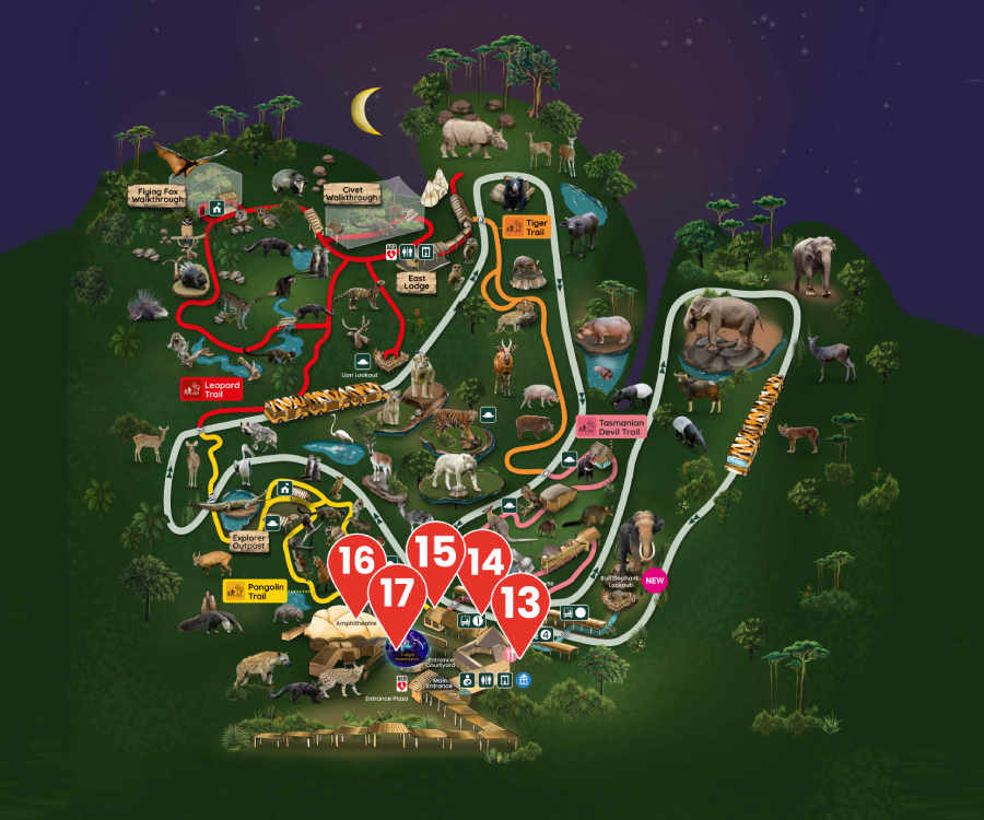 Pick from four differently themed walking trails under softly lit canopies allowing close-up views of animals not accessible on the Safari Tram Adventure.